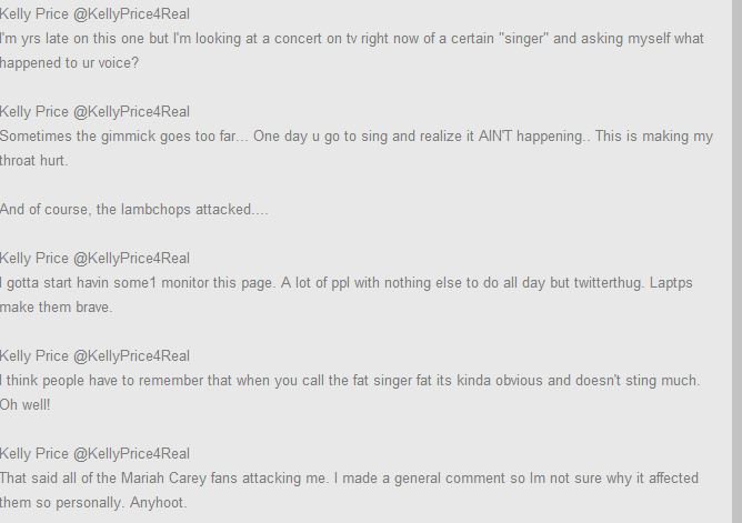 Kelly Price n’était pas de bonne humeur hier. L’ex choriste de Mariah Carey connue pour ses attitudes de grandes divas regardait un concert de son ancienne patronne ” The Adventures Of Mimi” quand l’idée lui est venu de le commenter sur la toile. Elle a donc tweeté: