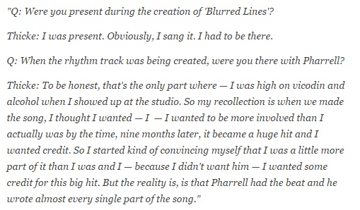 Une telle révélation est assez particulière car tout d’abord, Robin Thicke est un song-writer. On est pas dans le cas de quelqu’un qui ne sait pas écrire et à qui on fait tout. Non, il écrit entièrement ses opus et avant de commencer sa carrière, il écrivait pour les autres et était reconnu pour ça. Le fait qu’il declare maintenant à la face du monde qu’il n’a pas écrit ” Blurred Lines” doit venir du fait qu’il ait envie de se dissocier de cette chanson. Le retour du bâton après le succès a été énorme, un mauvais coup pour son image. Il est passé du gendre idéal au parfait goujat et a aliéné une bonne partie de sa fan base féminine. Le fait de dire qu’il n’a pas écrit ce titre doit être une manière de s’amender auprès d’elles. Il va jusqu’à dire qu’il était drogué au moment du studio, façon de signifier qu’il n’était réellement pas dans son état normal.