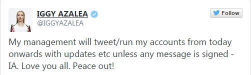 Excédée par les derniers commentaires violents et haineux à son encontre, Iggy Azalea a décidé de quitter les réseaux sociaux et d’abandonner ses comptes à son équipe de communication.
