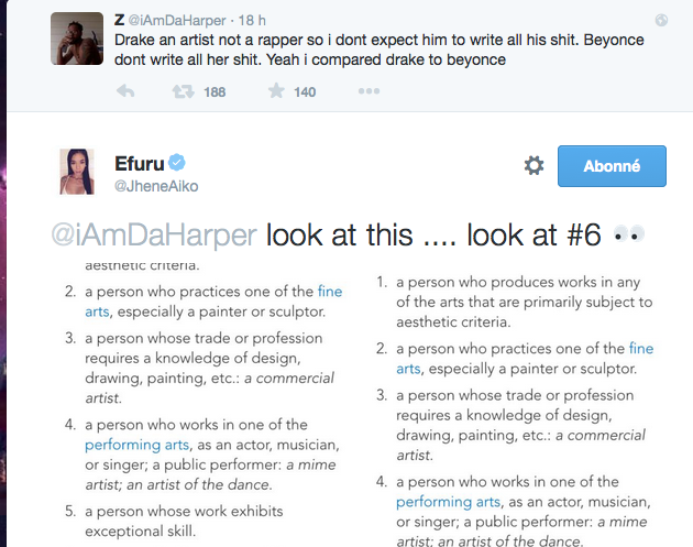 On aurait pu croire qu’elle a insulté, ou qu’elle a été violente…. mais elle a fait mieux que tout ça, elle a posté la définition du mot ‘ artiste”. Un ami à elle a posté “ Drake est un artiste, ce n’est pas un rappeur dont je ne m’attends pas à ce qu’il écrive ses propres chansons. Beyonce n’écrit pas ses propres chansons. Oui je compare Beyonce à Drake”.