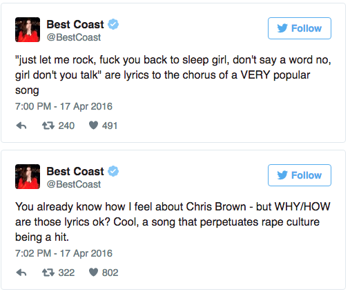 “Vous savez déjà ce que je pense de Chris Brown, mais pourquoi et comment ce genre de paroles sont-elles admissibles? une chanson qui perpétue la culture du viol devient un hit.”