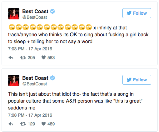 La chanteuse américaine du groupe de rock Best Coast défraie la chronique depuis plusieurs heures. Elle accuse Chris Brown de perpétuer la culture du viol avec les paroles de son dernier single “Back To Sleep”.