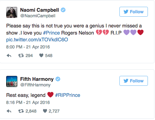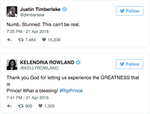 Justin Timberlake, Kelly Rowland, Jennifer Lopez Samuel L. Jackson, Naomi Campbell et plusieurs autres personnalités sont sous le choc. Les artistes et célébrités réagissent au décès de Prince depuis quelques heures sur la toile.