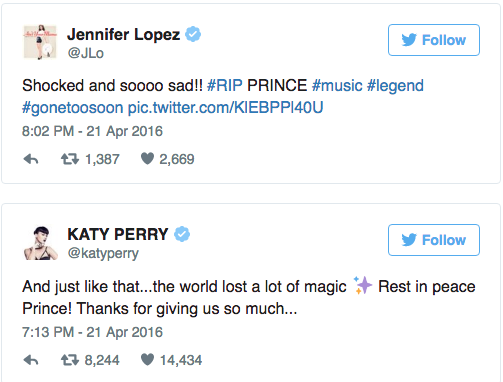 Katy Perry : “Et juste comme ça, le monde a perdu de sa magie. R.IP Prince et merci d’avoir tant donné”.
