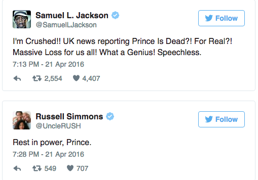 Samuel L.Jackson : ” Je tombe des nues, les infos anglaises annoncent que Prince est mort. Vraiment? Enorme perte pour nous. Quel immense génie. Je n’ai pas de mots”.