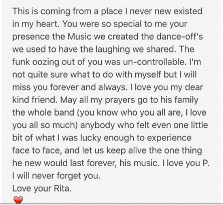 “Ceci vient d’un lieu dans mon cœur dont j’ignorai jusque la l’existence. Tu étais quelqu’un d’exceptionnel à mes yeux, ta présence, la musique que nous avons crée, les battles qu’on a fait et tous ces fou rire qu’on a partagé. L’énergie qui émanait de toi était in-docile ! Je ne sais que faire, mais je sais que tu me manqueras à jamais. Je t’aime mon cher et tendre ami Toutes mes prières vont à sa famille, à tout le groupe (pas besoin de vous citer, je vous aime tous tellement) à quiconque a pu ressentir même une petite once de ce que j’ai eu la chance d’expérimenter en face à face, et ne laissons pas s’éteindre la seule qu’il savait éternel, sa musique. Je t’aime P. Je ne t’oublierai jamais Avec tout mon amour. Ta Rita”