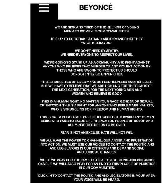 Choquée et visiblement touchée par les récentes tueries aux USA, Beyonce a publié une lettre ouverte dans laquelle elle appelle à l’unité et a une sorte de rébellion de la communauté noire américaine contre le système. Le message est écrit en lettres capitales, en noir et blanc, l’heure est grave. C’est plus fort, plus puissant et moins ambivalent que tout son dernier album.