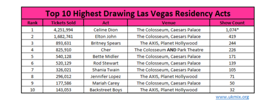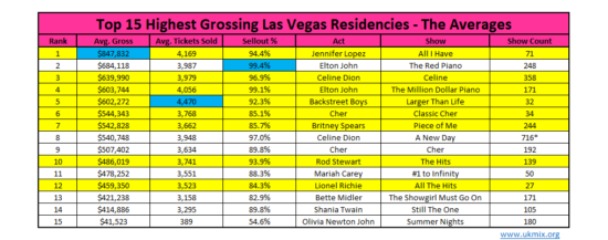 Jennifer Lopez avec son “All I Have” a ramené 296.012 spectateurs, sur les 71 représentations qu’elle a donné. Elle se place donc devant Mariah qui, elle a ramené 177.586 spectateurs, mais elle n’a donné que 50 shows. Sur cette partie du deal, on pourrait se dire que c’est une manche nulle. L’écart entre le nombre de spectateurs est important, mais sachant que le nombre de shows n’est pas totalement équivalent. Mettons les sur un pied d’égalité et aller chercher du côté des vrais chiffres.