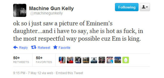 En 2012, Machine Gun Kelly qui n’a que 21 ans à l’époque et qui est très fan d’Eminem fait un tweet.
