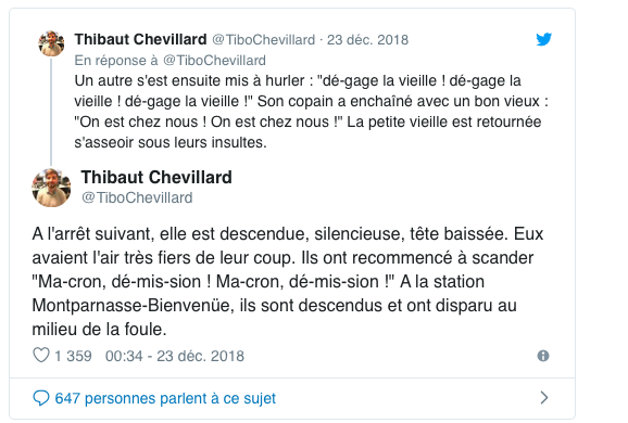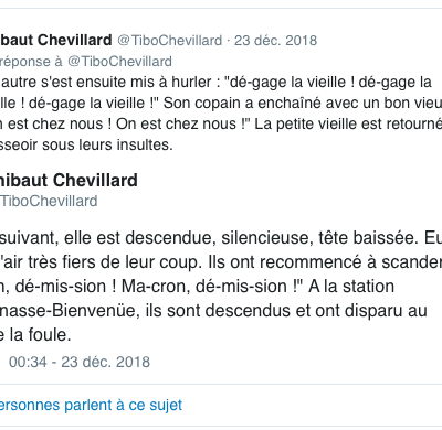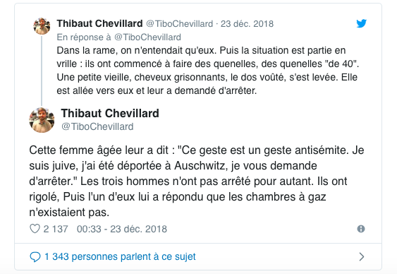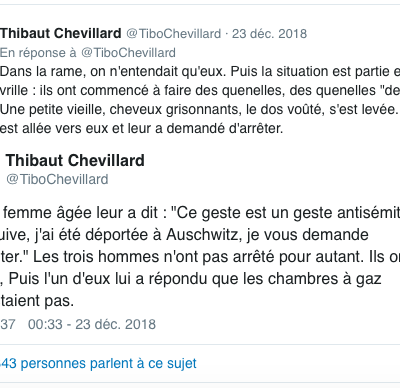 J’ai lié cet évènement à un autre tweet que j’ai vu cette même semaine. C’est le journaliste, Thibaut Chevillard, qui lui racontait cette fois une scène dans le métro. Il est un homme de médias, qui s’est retrouvé dans le Metro en compagnie de gilets jaunes un peu éméchés exerçant des gestes anti-sémites face à une rescapée des chambres à Gaz.